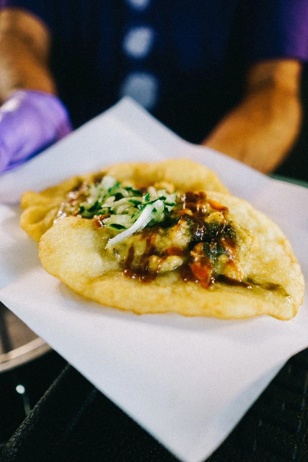 A classic Doubles features two fluffy, glutenous flatbreads (bara) topped with curried chickpeas (channa), tamarind sauce, shado beni sauce, grated cucumbers and an optional hot pepper sauce. Every component of a Beni Doubles is made from scratch and is 100% unforced vegan.